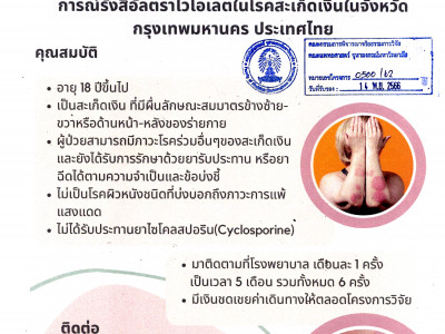 เปิดรับสมัครผู้เข้าร่วมวิจัยโครงการนำร่องการศึกษาประสิทธิผลและความปลอดภัยของการรักษาด้วยแสงอาทิตย์ธรรมชาติจากโมเดลคาดการณ์รังสีอัลตราไวโอเลตในโรคสะเก็ดเงินในกรุงเทพมหานคร Posted on15 ธ.ค. 2023Tags#mdcu, chula, chulalongkorn, medicine, คณะแพทยศาสตร์จุฬาลงกรณ์มหาวิทยาลัย, คณะแพทยศาสตร์จุฬาฯ, คณะแพทย์จุฬาฯ, แพทย์จุฬาฯ