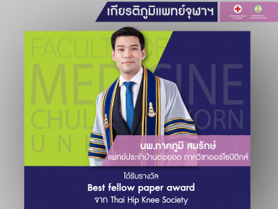 นพ.ภาคภูมิ สมรักษ์ แพทย์ประจำบ้านต่อยอด ภาควิชาออร์โธปิดิกส์ ได้รับรางวัล Best fellow paper award จาก Thai Hip Knee Society (เกียรติภูมิแพทย์จุฬาฯ) Posted on19 ธ.ค. 2023Tags#mdcu, chula, chulalongkorn, medicine, คณะแพทยศาสตร์จุฬาลงกรณ์มหาวิทยาลัย, คณะแพทยศาสตร์จุฬาฯ, คณะแพทย์จุฬาฯ, เกียรติภูมิแพทย์จุฬาฯ, แพทย์จุฬาฯ