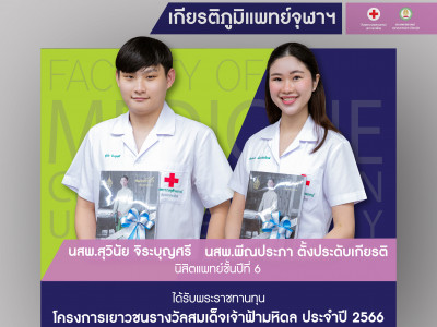 นสพ.สุวินัย จิระบุญศรี และ นสพ.พีณประภา ตั้งประดับเกียรติ นิสิตแพทย์ ชั้นปีที่ 6 ได้รับพระราชทานทุนโครงการเยาวชนรางวัลสมเด็จเจ้าฟ้ามหิดล ประจำปี 2566 (เกียรติภูมิแพทย์จุฬาฯ) Posted on19 ธ.ค. 2023Tags#mdcu, chula, chulalongkorn, medicine, คณะแพทยศาสตร์จุฬาลงกรณ์มหาวิทยาลัย, คณะแพทยศาสตร์จุฬาฯ, คณะแพทย์จุฬาฯ, เกียรติภูมิแพทย์จุฬาฯ, แพทย์จุฬาฯ
