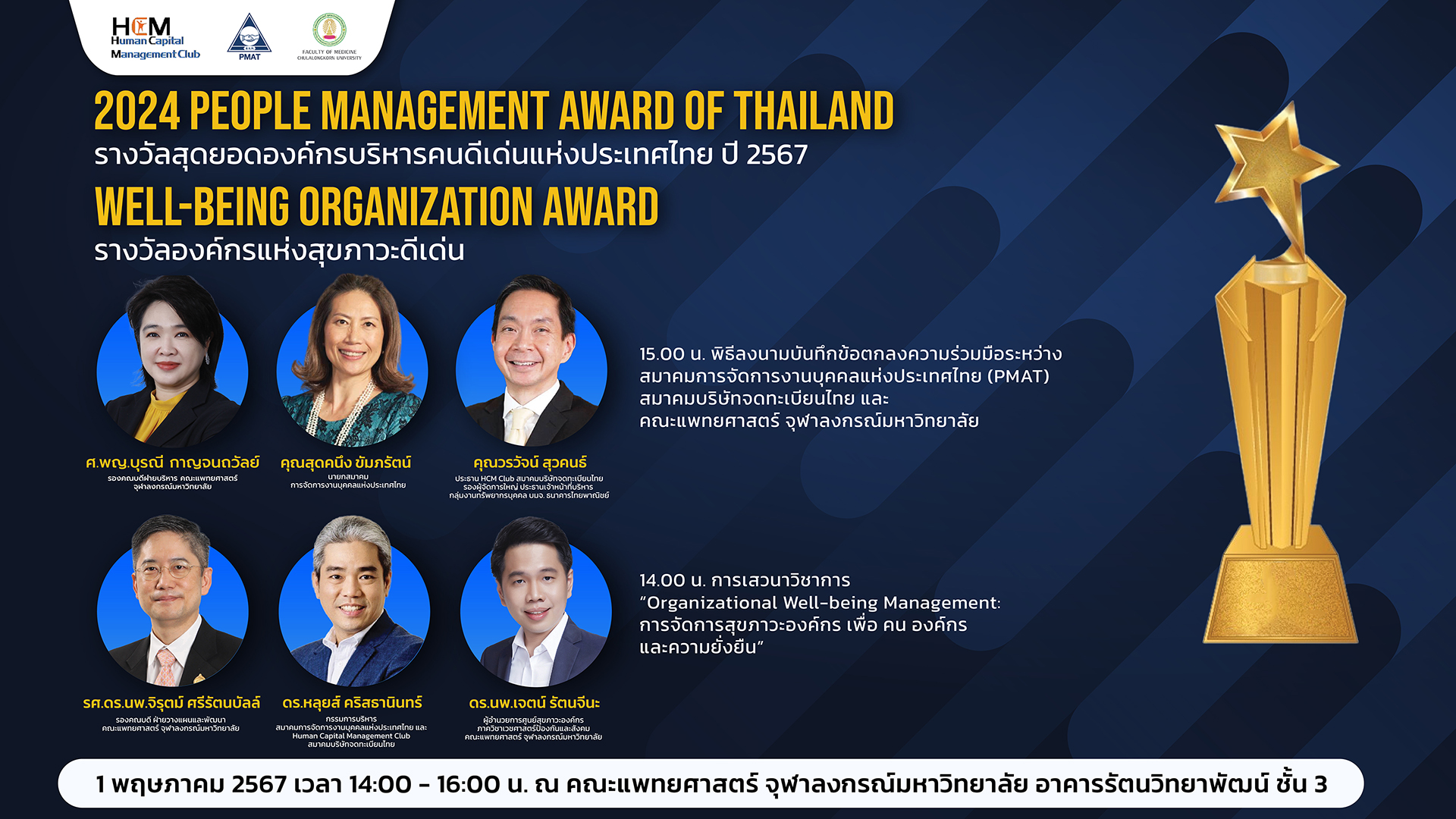 ✨ พิธีลงนามบันทึกข้อตกลงความร่วมมือ สมาคมการจัดการงานบุคคลแห่งประเทศไทย (PMAT) Human Capital Management Club สมาคมบริษัทจดทะเบียนไทย และคณะแพทยศาสตร์ จุฬาลงกรณ์มหาวิทยาลัย การพัฒนางานวิจัย (Research) ผสานกับแนวทางการปฏิบัติ (Practice) มาจัดตั้งเกณฑ์ มาตรฐาน การประเมินรวมถึงตัวชี้วัด และดัชนี (Index) ต่าง ๆ อันจะเป็นประโยชน์ต่อการให้คำแนะนำองค์กร เพื่อการเป็นสุดยอดองค์กรที่ดูแลสุขภาวะและความเป็นอยู่ที่ดีขององค์กร (Well-being Organization) ของประเทศไทยต่อไป โดยความร่วมมือจากทั้งสามหน่วยงานชั้นนำระดับประเทศ ด้านการบริหารคน และการสร้างสุขภาวะองค์กร นำโดย
