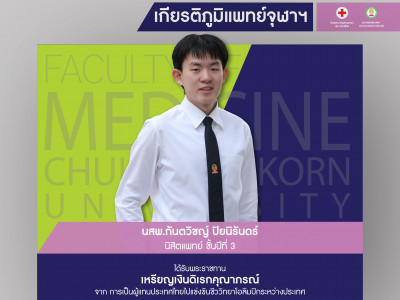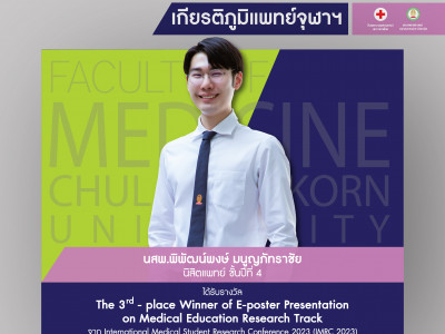นสพ.พิพัฒน์พงษ์ มนูญภัทราชัย นิสิตแพทย์ ชั้นปีที่ 4 ได้รับรางวัล The 3rd – place Winner of E-poster Presentation on Medical Education Research Track (เกียรติภูมิแพทย์จุฬาฯ) Posted on10 ม.ค. 2024Tags#mdcu, chula, chulalongkorn, medicine, คณะแพทยศาสตร์จุฬาลงกรณ์มหาวิทยาลัย, คณะแพทยศาสตร์จุฬาฯ, คณะแพทย์จุฬาฯ, แพทย์จุฬาฯ
