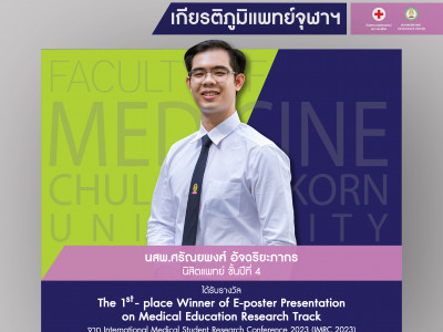 นสพ.ศรัณยพงศ์ อัจฉริยะภากร นิสิตแพทย์ ชั้นปีที่ 4 ได้รับรางวัล The 1st- place Winner of E-poster Presentation on Medical Education Research Track (เกียรติภูมิแพทย์จุฬาฯ) Posted on10 ม.ค. 2024Tags#mdcu, chula, chulalongkorn, medicine, คณะแพทยศาสตร์จุฬาลงกรณ์มหาวิทยาลัย, คณะแพทยศาสตร์จุฬาฯ, คณะแพทย์จุฬาฯ, เกียรติภูมิแพทย์จุฬาฯ, แพทย์จุฬาฯ