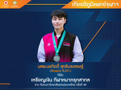 นสพ.นรกิตติ์ สุทธินรเศรษฐ์ นิสิตแพทย์ ชั้นปีที่ 2 ได้รับเหรียญเงิน กีฬาหมากรุกสากล จากกีฬามหาวิทยาลัยแห่งประเทศไทย ครั้งที่ 49 Posted on03 เม.ย. 2024Tags#mdcu, chula, chulalongkorn, medicine, คณะแพทยศาสตร์จุฬาลงกรณ์มหาวิทยาลัย, คณะแพทยศาสตร์จุฬาฯ, คณะแพทย์จุฬาฯ, เกียรติภูมิแพทย์จุฬาฯ, แพทย์จุฬาฯ
