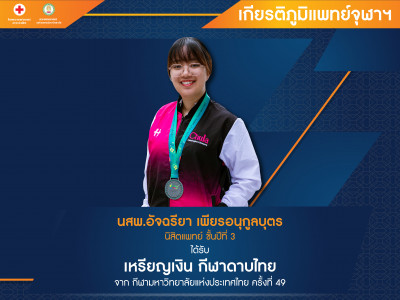 นสพ.อัจฉรียา เพียรอนุกูลบุตร นิสิตแพทย์ ชั้นปีที่ 3 ได้รับเหรียญเงิน กีฬาดาบไทย จากกีฬามหาวิทยาลัยแห่งประเทศไทย ครั้งที่ 49 Posted on03 เม.ย. 2024Tags#mdcu, chula, chulalongkorn, medicine, คณะแพทยศาสตร์จุฬาลงกรณ์มหาวิทยาลัย, คณะแพทยศาสตร์จุฬาฯ, คณะแพทย์จุฬาฯ, เกียรติภูมิแพทย์จุฬาฯ, แพทย์จุฬาฯ