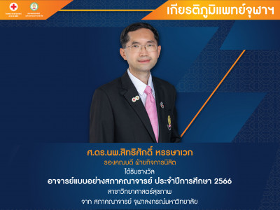 ศ.ดร.นพ.สิทธิศักดิ์ หรรษาเวก รองคณบดี ฝ่ายกิจการนิสิต ได้รับรางวัลอาจารย์แบบอย่างสภาคณาจารย์ ประจำปีการศึกษา 2566 Posted on10 มิ.ย. 2024Tags#mdcu, chula, chulalongkorn, medicine, คณะแพทยศาสตร์จุฬาลงกรณ์มหาวิทยาลัย, คณะแพทยศาสตร์จุฬาฯ, คณะแพทย์จุฬาฯ, เกียรติภูมิแพทย์จุฬาฯ, แพทย์จุฬาฯ