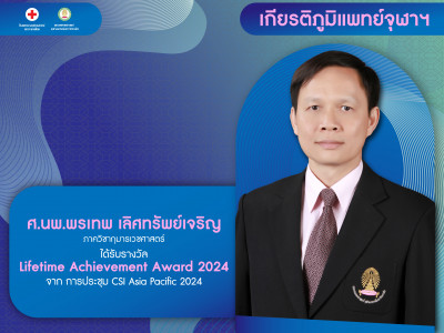 ศ.นพ.พรเทพ เลิศทรัพย์เจริญ ภาควิชากุมารเวชศาสตร์ ได้รับรางวัล Lifetime Achievement Award 2024 Posted on28 ต.ค. 2024Tags#mdcu, chula, chulalongkorn, medicine, คณะแพทยศาสตร์จุฬาลงกรณ์มหาวิทยาลัย, คณะแพทยศาสตร์จุฬาฯ, คณะแพทย์จุฬาฯ, เกียรติภูมิแพทย์จุฬาฯ, แพทย์จุฬาฯ