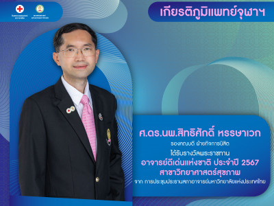 ศ.ดร.นพ.สิทธิศักดิ์ หรรษาเวก รองคณบดี ฝ่ายกิจการนิสิต ได้รับรางวัลพระราชทานอาจารย์ดีเด่นแห่งชาติ ประจำปี 2567 สาขาวิทยาศาสตร์สุขภาพ (เกียรติภูมิแพทย์จุฬาฯ) Posted on31 ต.ค. 2024Tags#mdcu, chula, chulalongkorn, medicine, คณะแพทยศาสตร์จุฬาลงกรณ์มหาวิทยาลัย, คณะแพทยศาสตร์จุฬาฯ, คณะแพทย์จุฬาฯ, เกียรติภูมิแพทย์จุฬาฯ, แพทย์จุฬาฯ