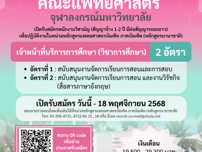 คณะแพทยศาสตร์ จุฬาลงกรณ์มหาวิทยาลัย เปิดรับสมัครบุคคลเพื่อเข้ารับการคัดเลือกเป็น “พนักงานวิสามัญ” ตำแหน่ง “เจ้าหน้าที่บริการการศึกษา (วิชาการศึกษา)” จำนวน 2 อัตรา Posted on07 พ.ย. 2025Tags#mdcu, chula, chulalongkorn, cumedi, medicine, คณะแพทยศาสตร์จุฬาลงกรณ์มหาวิทยาลัย, คณะแพทยศาสตร์จุฬาฯ, คณะแพทย์จุฬาฯ, รับสมัครงาน, แพทย์จุฬาฯ