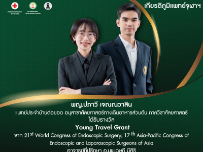 พญ.ปภาวี เจณณวาสิน แพทย์ประจำบ้านต่อยอด อนุสาขาศัลยศาสตร์ทางเดินอาหารส่วนต้น ภาควิชาศัลยศาสตร์ ได้รับรางวัล Young Travel Grant (เกียรติภูมิแพทย์จุฬาฯ) Posted on16 ธ.ค. 2025Tags#mdcu, chula, chulalongkorn, medicine, คณะแพทยศาสตร์จุฬาลงกรณ์มหาวิทยาลัย, คณะแพทยศาสตร์จุฬาฯ, คณะแพทย์จุฬาฯ, เกียรติภูมิแพทย์จุฬาฯ, แพทย์จุฬาฯ