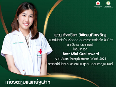 พญ.อัจฉริยา วิพัฒนกิจเจริญ แพทย์ประจำบ้านต่อยอด อนุสาขาโรคไต ชั้นปีที่2 ภาควิชาอายุรศาสตร์ ได้รับรางวัล Best Mini-Oral Award (เกียรติภูมิแพทย์จุฬาฯ) Posted on16 ธ.ค. 2025Tags#mdcu, chula, chulalongkorn, medicine, คณะแพทยศาสตร์จุฬาลงกรณ์มหาวิทยาลัย, คณะแพทยศาสตร์จุฬาฯ, คณะแพทย์จุฬาฯ, เกียรติภูมิแพทย์จุฬาฯ, แพทย์จุฬาฯ