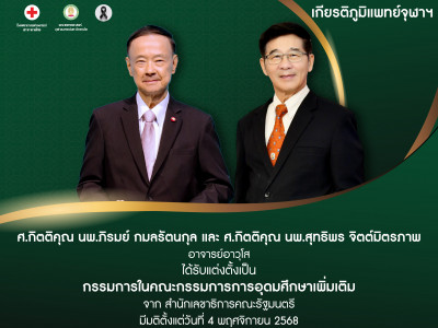 ศ.กิตติคุณ นพ.ภิรมย์ กมลรัตนกุล และศ.กิตติคุณ นพ.สุทธิพร จิตต์มิตรภาพ อาจารย์อาวุโส ได้แต่งตั้งเป็นกรรมการในคณะกรรมการการอุดมศึกษาเพิ่มเติม (เกียรติภูมิแพทย์จุฬาฯ) Posted on16 ธ.ค. 2025Tags#mdcu, chula, chulalongkorn, medicine, คณะแพทยศาสตร์จุฬาลงกรณ์มหาวิทยาลัย, คณะแพทยศาสตร์จุฬาฯ, คณะแพทย์จุฬาฯ, เกียรติภูมิแพทย์จุฬาฯ, แพทย์จุฬาฯ