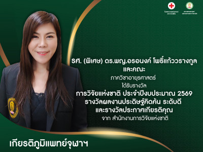 รศ. (พิเศษ) ดร.พญ.อรอนงค์ โพธิ์แก้ววรางกูล และคณะ ภาควิชาอายุรศาสตร์ ได้รับรางวัลการวิจัยแห่งชาติ ประจำปีงบประมาณ 2569 (เกียรติภูมิแพทย์จุฬาฯ) Posted on16 ธ.ค. 2025Tags#mdcu, chula, chulalongkorn, medicine, คณะแพทยศาสตร์จุฬาลงกรณ์มหาวิทยาลัย, คณะแพทยศาสตร์จุฬาฯ, คณะแพทย์จุฬาฯ, เกียรติภูมิแพทย์จุฬาฯ, แพทย์จุฬาฯ