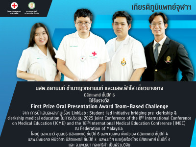 ได้รับรางวัล First Prize Oral Presentation Award Team-Based Challenge (เกียรติภูมิแพทย์จุฬาฯ) Posted on04 มี.ค. 2026Tags#mdcu, chulalongkorn, medicine, คณะแพทยศาสตร์จุฬาลงกรณ์มหาวิทยาลัย, คณะแพทยศาสตร์จุฬาฯ, คณะแพทย์จุฬาฯ, เกียรติภูมิแพทย์จุฬาฯ, แพทย์จุฬาฯ