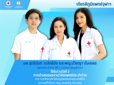 รางวัลที่ 2 การนำเสนอผลงานวิจัยแพทย์ประจำบ้าน จากราชวิทยาลัยวิสัญญีแพทย์แห่งประเทศไทย อาจารย์ที่ปรึกษา พญ.ปองขวัญ จินาวรณ์ (เกียรติภูมิแพทย์จุฬาฯ) Posted on27 มี.ค. 2026Tags#mdcu, chula, chulalongkorn, medicine, คณะแพทยศาสตร์จุฬาลงกรณ์มหาวิทยาลัย, คณะแพทยศาสตร์จุฬาฯ, คณะแพทย์จุฬาฯ, เกียรติภูมิแพทย์จุฬาฯ, แพทย์จุฬาฯ