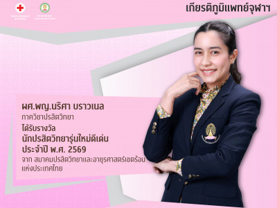 ผศ.พญ.นริศา บราวเนล ภาควิชาปรสิตวิทยา ได้รับรางวัลนักปรสิตวิทยารุ่นใหม่ดีเด่น ประจำปี พ.ศ. 2569 (เกียรติภูมิแพทย์จุฬาฯ) Posted on27 มี.ค. 2026Tags#mdcu, chula, chulalongkorn, medicine, คณะแพทยศาสตร์จุฬาลงกรณ์มหาวิทยาลัย, คณะแพทยศาสตร์จุฬาฯ, คณะแพทย์จุฬาฯ, เกียรติภูมิแพทย์จุฬาฯ, แพทย์จุฬาฯ