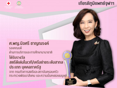 ศ.พญ.นิจศรี ชาญณรงค์ รองคณบดี ด้านการบริการและการศึกษานานาชาติ ได้รับรางวัลสตรีดีเด่นในเวที/เครือข่ายระดับสากล ประเภทบุคคลภาครัฐ (เกียรติภูมิแพทย์จุฬาฯ) Posted on27 มี.ค. 2026Tags#mdcu, chula, chulalongkorn, medicine, คณะแพทยศาสตร์จุฬาลงกรณ์มหาวิทยาลัย, คณะแพทยศาสตร์จุฬาฯ, คณะแพทย์จุฬาฯ, เกียรติภูมิแพทย์จุฬาฯ, แพทย์จุฬาฯ
