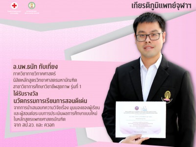 อ.นพ.ธนัท ทับเที่ยง ภาควิชากายวิภาคศาสตร์ และนิสิตหลักสูตรวิทยาศาสตรมหาบัณฑิต สาขาวิชาการศึกษาวิชาชีพสุขภาพ รุ่นที่ 1 ได้รับรางวัลนวัตกรรมการเรียนการสอนดีเด่น (เกียรติภูมิแพทย์จุฬาฯ) Posted on27 มี.ค. 2026Tags#mdcu, chula, chulalongkorn, medicine, คณะแพทยศาสตร์จุฬาลงกรณ์มหาวิทยาลัย, คณะแพทยศาสตร์จุฬาฯ, คณะแพทย์จุฬาฯ, เกียรติภูมิแพทย์จุฬาฯ, แพทย์จุฬาฯ
