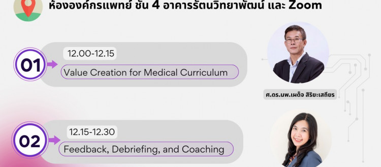 📍 ห้ององค์กรแพทย์ ชั้น 4 อาคารรัตนวิทยาพัฒน์ และ Online ผ่าน zoom meeting (มีอาหารกลางวันและเครื่องดื่มสำหรับอาจารย์ที่ลงทะเบียนไว้ก่อนและมาประชุม onsite)