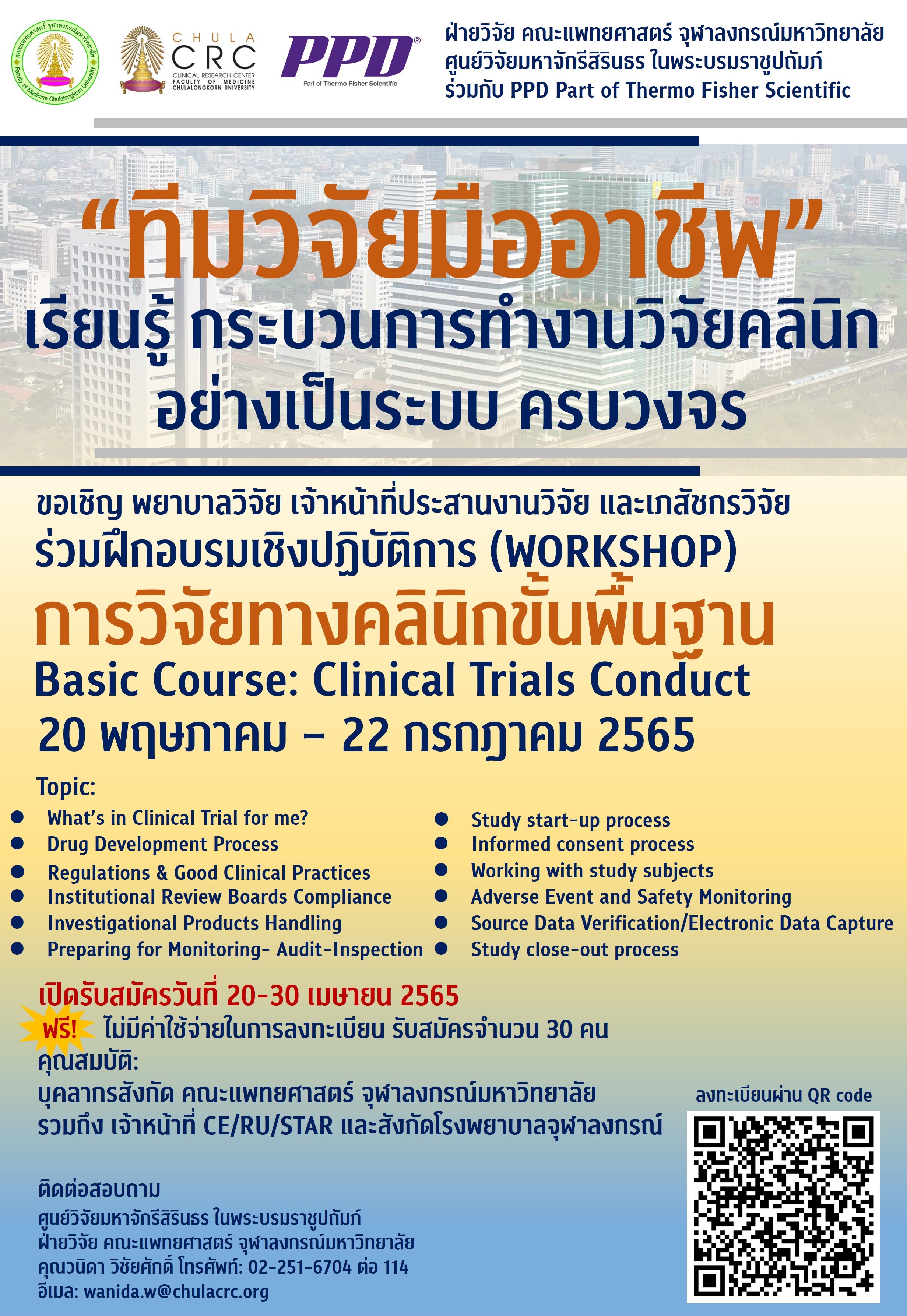 22 เม.ย. 2022 ขอเชิญผู้สนใจเข้าร่วมประชุมการวิจัยทางคลินิกขั้นพื้นฐาน (Basic Course: Clinical Trials Conduct) ระหว่างวันที่ 20 พค – 20 กค 2565 /Tags#mdcu, chula, chulalongkorn, medicine, คณะแพทยศาสตร์จุฬาลงกรณ์มหาวิทยาลัย, คณะแพทยศาสตร์จุฬาฯ, คณะแพทย์จุฬาฯ, แพทย์จุฬาฯ ทีมวิจัยมืออาชีพ 01 ทีมวิจัยมืออาชีพ 02 กลับไปหน้าข่าวประชาสัมพันธ์