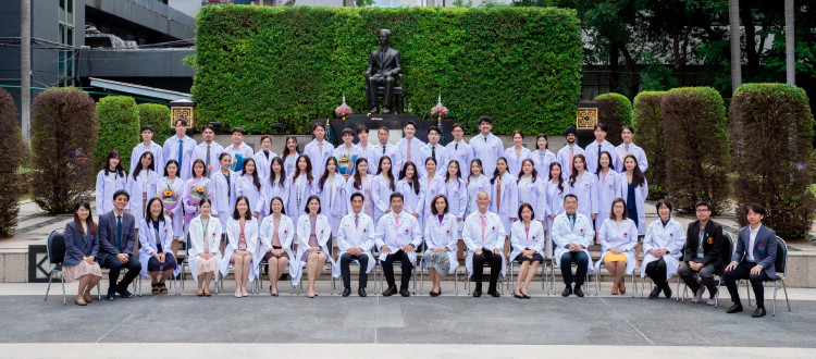 รศ.นพ.ฉันชาย สิทธิพันธุ์ คณบดี คณะแพทยศาสตร์ จุฬาลงกรณ์มหาวิทยาลัย พร้อมด้วย ศ.นพ.สุทธิพงศ์ วัชรสินธุ ผู้ก่อตั้งหลักสูตรแพทยศาสตรบัณฑิต ภาคบัณฑิต (หลักสูตรนานาชาติ) ศ.พญ.นิจศรี ชาญณรงค์ รองคณบดีฝ่ายบริการวิชาการ คณะแพทยศาสตร์ จุฬาลงกรณ์มหาวิทยาลัย และ ผู้อำนวยการหลักสูตรแพทยศาสตรบัณฑิต ภาคบัณฑิต (หลักสูตรนานาชาติ) และ รศ.นพ.ศักนัน มะโนทัย รองคณบดีฝ่ายวิชาการ คณะแพทยศาสตร์ จุฬาลงกรณ์มหาวิทยาลัย ร่วมกันมอบเสื้อกาวน์และเข็มพระเกี้ยวที่ระลึกให้แก่นิสิตหลักสูตรแพทยศาสตรบัณฑิต ภาคบัณฑิต (หลักสูตรนานาชาติ) หรือ CU-MEDi “รุ่นที่ 5” ประจำปีการศึกษา 2568 จำนวน 40 คน