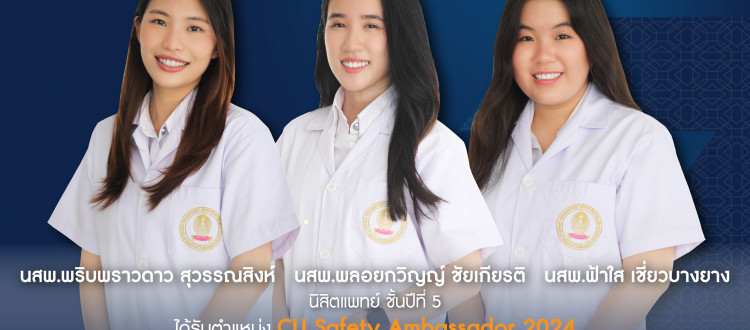 1 ต.ค. 2024 CU Safety Ambassador 2024 ทูตวัฒนธรรมความปลอดภัยของจุฬาลงกรณ์มหาวิทยาลัย 2024 และได้รับรางวัลรองชนะเลิศ Rising Star (เกียรติภูมิแพทย์จุฬาฯ) /Tags#mdcu, chula, chulalongkorn, medicine, คณะแพทยศาสตร์จุฬาลงกรณ์มหาวิทยาลัย, คณะแพทยศาสตร์จุฬาฯ, คณะแพทย์จุฬาฯ, เกียรติภูมิแพทย์จุฬาฯ, แพทย์จุฬาฯ กลับไปหน้าข่าวประชาสัมพันธ์