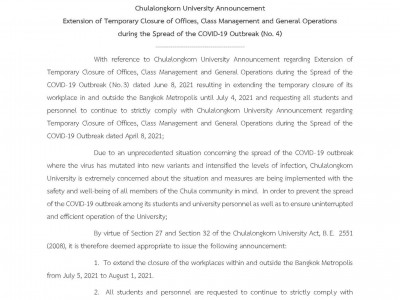Chulalongkorn University Announcement Extension of Temporary Closure of Offices, Class Management and General Operations during the Spread of the COVID-19 (No. 4) Posted on27 Jun 2021Tags#mdcu, chula, chulalongkorn, Covid19, medicine