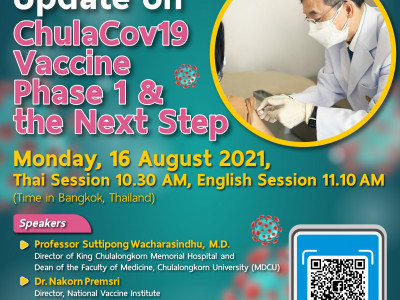 Update on ChulaCov19 Vaccine Phase 1 & the Next Step Posted on13 Aug 2021Tags#mdcu, chula, ChulaCov19, chulalongkorn, ChulaVRC, Covid19, covidvaccine, medicine, mRNAVaccine, teamthailand cordially invite you to join the Live Press Conference “Update on ChulaCov19 Vaccine Phase 1 & the Next Step” Monday, 16 August 2021 Thai Session... Read More