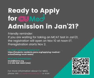 Friendly Reminder: If you are waiting for taking an MCAT test in January-February 2021, the registration will open on November 10 at noon ET. Preregistration starts November 2. For MCAT registration, please visit https://students-residents.aamc.org/app…/taking-mcat-exam/ MCAT Test Administrator (AAMC) E-mail: mcat@aamc.org Phone: (+1) 202-828-0400 (USA) Remark: The MCAT test dates and locations... Read More