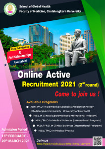 Dear all, Online active recruitment from Faculty of Medicine, Chulalongkorn University is now accepting applicants. The available study programs include: M.Sc./ Ph.D. in Clinical Sciences (International Program). Joint Ph.D. in Biomedical Sciences and Biotechnology (Chulalongkorn University – University of Liverpool). M.Sc./ Ph.D. in Medical Sciences (International Program). M.Sc./ Ph.D. in... Read More