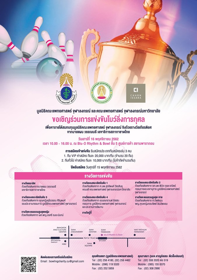 november, 2019 การแข่งขันโบว์ลิ่งการกุศล เพื่อหารายได้สมทบทุนมูลนิธิคณะแพทยศาสตร์ จุฬาลงกรณ์ 16nov10:00 am4:00 pmการแข่งขันโบว์ลิ่งการกุศล เพื่อหารายได้สมทบทุนมูลนิธิคณะแพทยศาสตร์ จุฬาลงกรณ์ชิงถ้วยรางวัลเกียรติยศจาก นายแผน วรรณเมธี เลขาธิการสภากาชาดไทย Event Detailsติดต่อสอบถาม 02- 256 4180 หรือ 02 - 308 2020 ต่อ 519 Event Details ติดต่อสอบถาม 02- 256 4180 หรือ 02 – 308 2020 ต่อ 519 Time(Saturday) 10:00 am - 4:00 pm CalendarGoogleCal