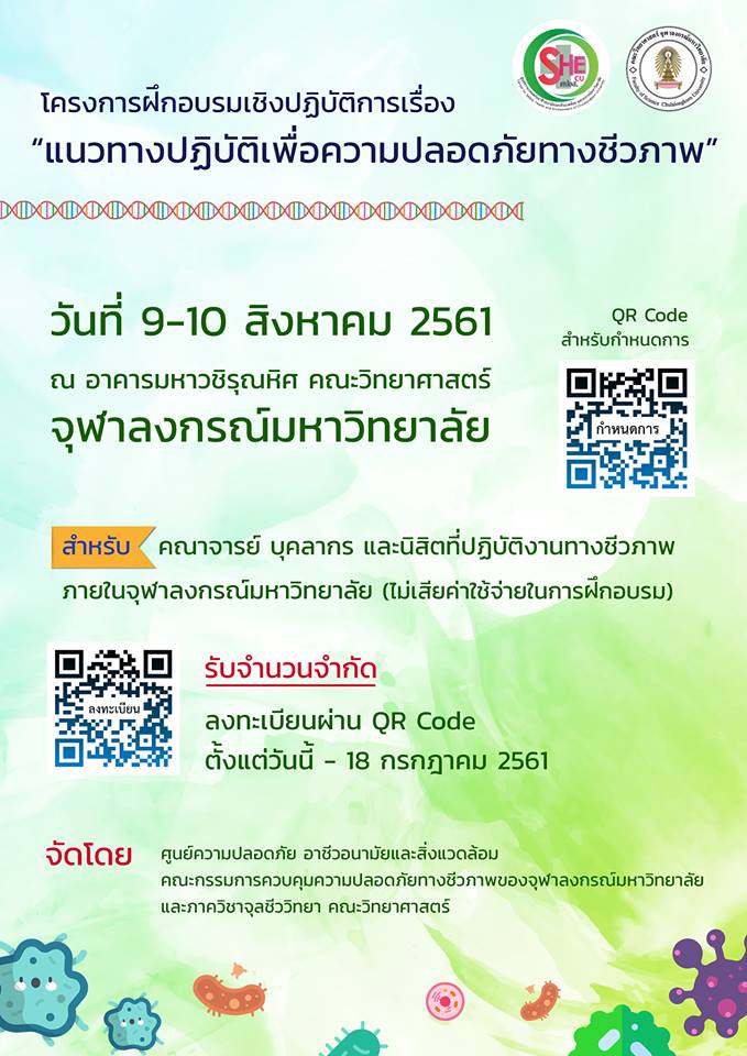 โครงการฝึกอบรมเชิงปฏิบัติการ เรื่อง แนวทางปฏิบัติเพื่อความปลอดภัยทางชีวภาพ วันที่ 9-10 สิงหาคม 2561 ณ อาคารมหาวชิรุณหิศ คณะวิทยาศาสตร์ จุฬาฯ