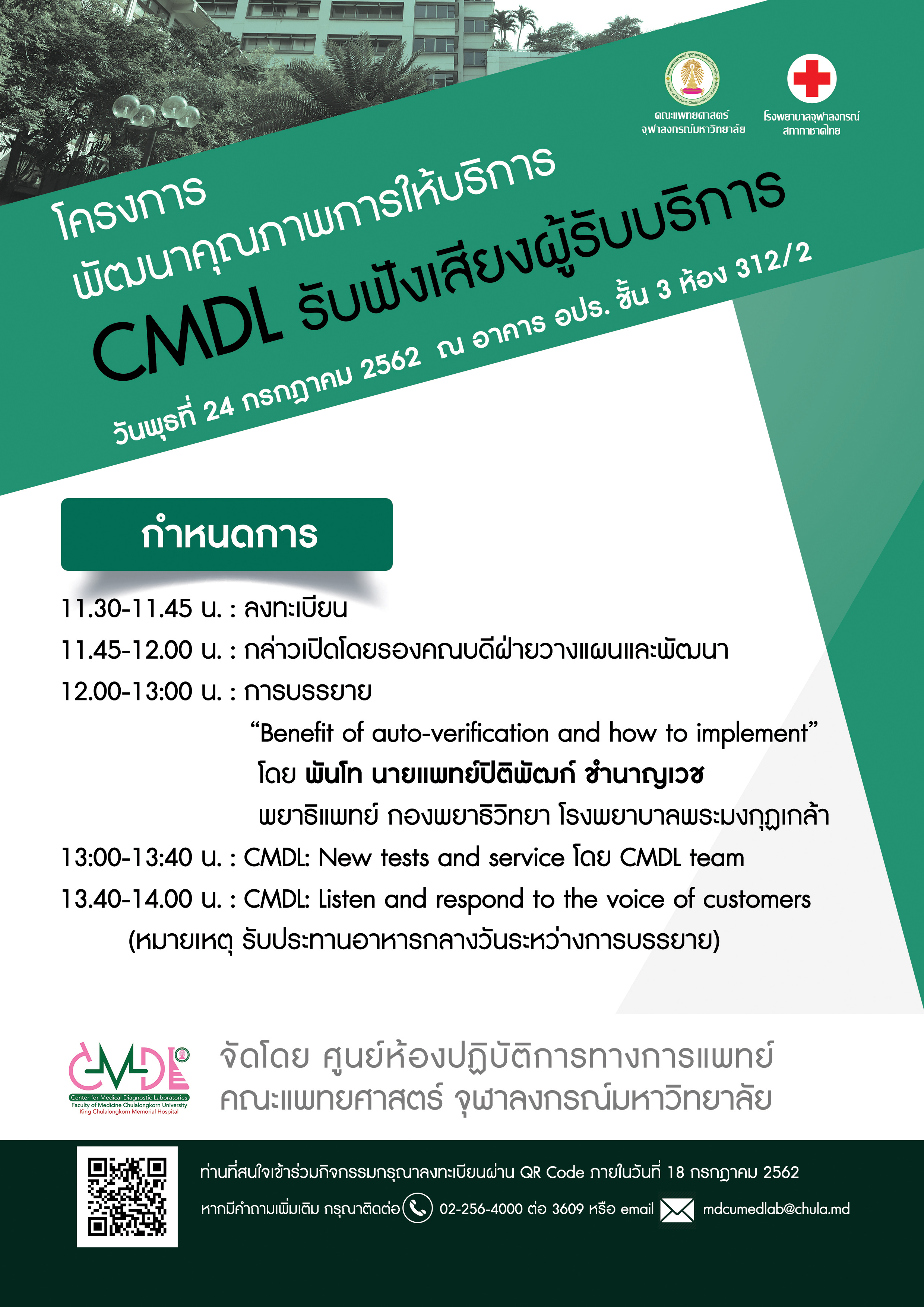 24jul11:30 am2:00 pmโครงการพัฒนาคุณภาพการให้บริการ CMDL รับฟังเสียงผู้รับบริการ