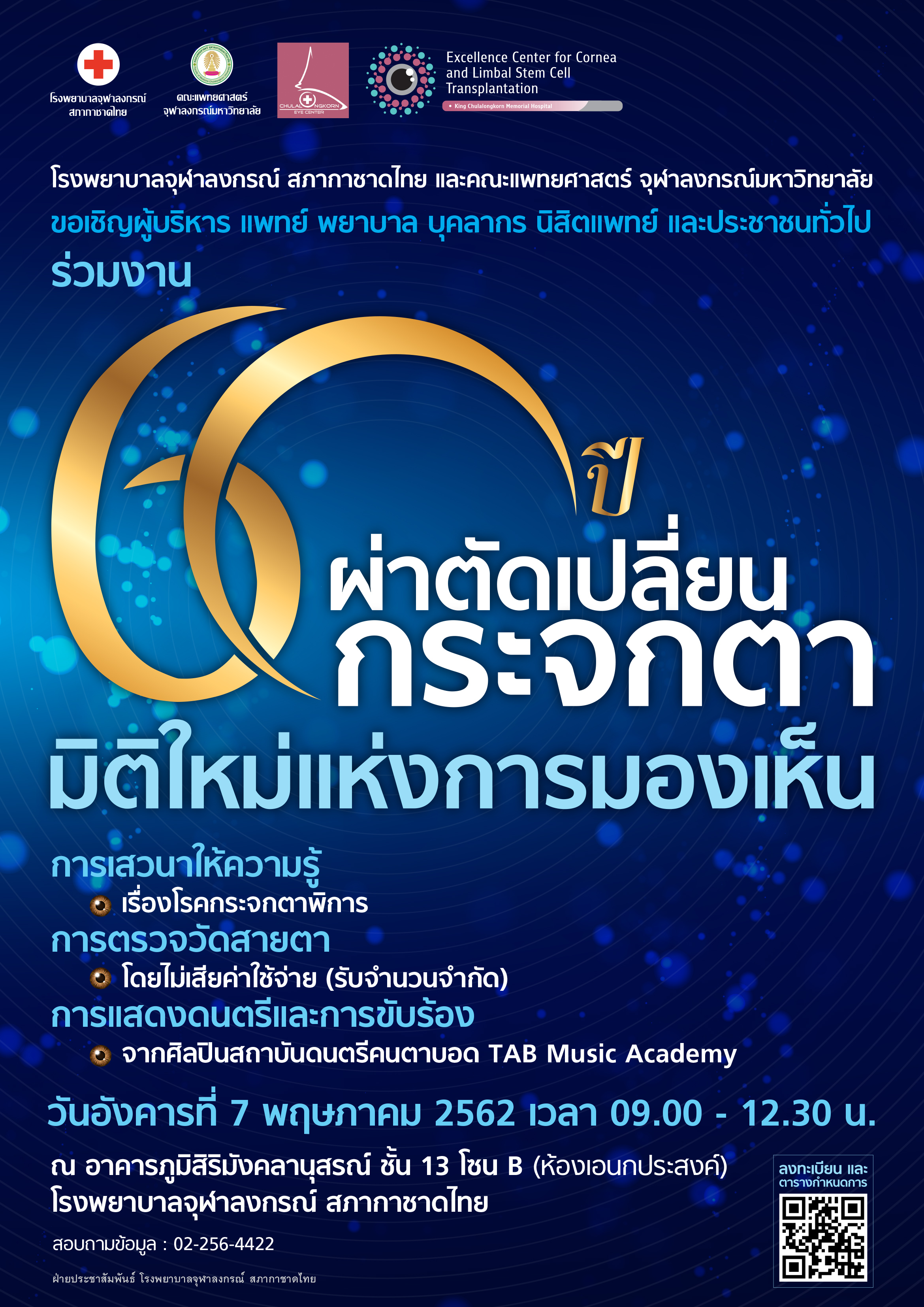 may, 2019 60 ปี ผ่าตัดเปลี่ยนกระจกตา มิติใหม่แห่งการมองเห็น 07may9:00 am12:30 pm60 ปี ผ่าตัดเปลี่ยนกระจกตา มิติใหม่แห่งการมองเห็น Time (Tuesday) 9:00 am - 12:30 pm Locationห้องอเนกประสงค์ ชั้น 13 โซน B โรงพยาบาลจุฬาลงกรณ์ สภากาชาดไทย CalendarGoogleCal