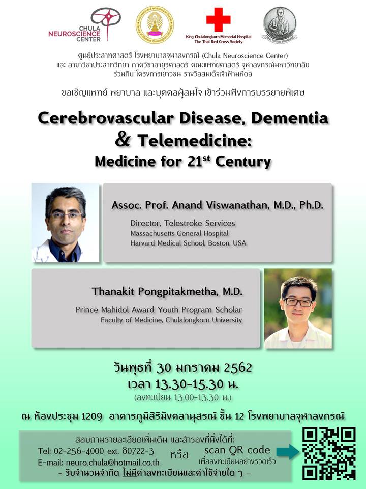 ศูนย์ประสาทศาสตร์ โรงพยาบาลจุฬาลงกรณ์ และสาขาวิชาประสาทวิทยา ภาควิชาอายุรศาสตร์ คณะแพทยศาสตร์ จุฬาลงกรณ์มหาวิทยาลัย ร่วมกับโครงการเยาวชน รางวัลสมเด็จเจ้าฟ้ามหิดล ขอเชิญแพทย์ พยาบาล และบุคคลผู้สนใจ เข้าร่วมฟังการบรรยายพิเศษ "Cerebrovascular Disease, Dementia & Telemedicine: Medicine for 21st Century"