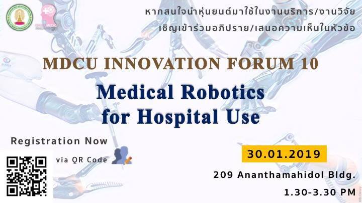 เชิญเข้าร่วมอภิปราย ในหัวข้อ MDCU INNOVATION FORUM 10 "Medical Robotics for Hospital Use" วันพุธที่ 30 มกราคม พ.ศ. 2562 เวลา 13.00 - 15.30 น. ณ ห้อง 209 ชั้น 2 อาคารอานันทมหิดล