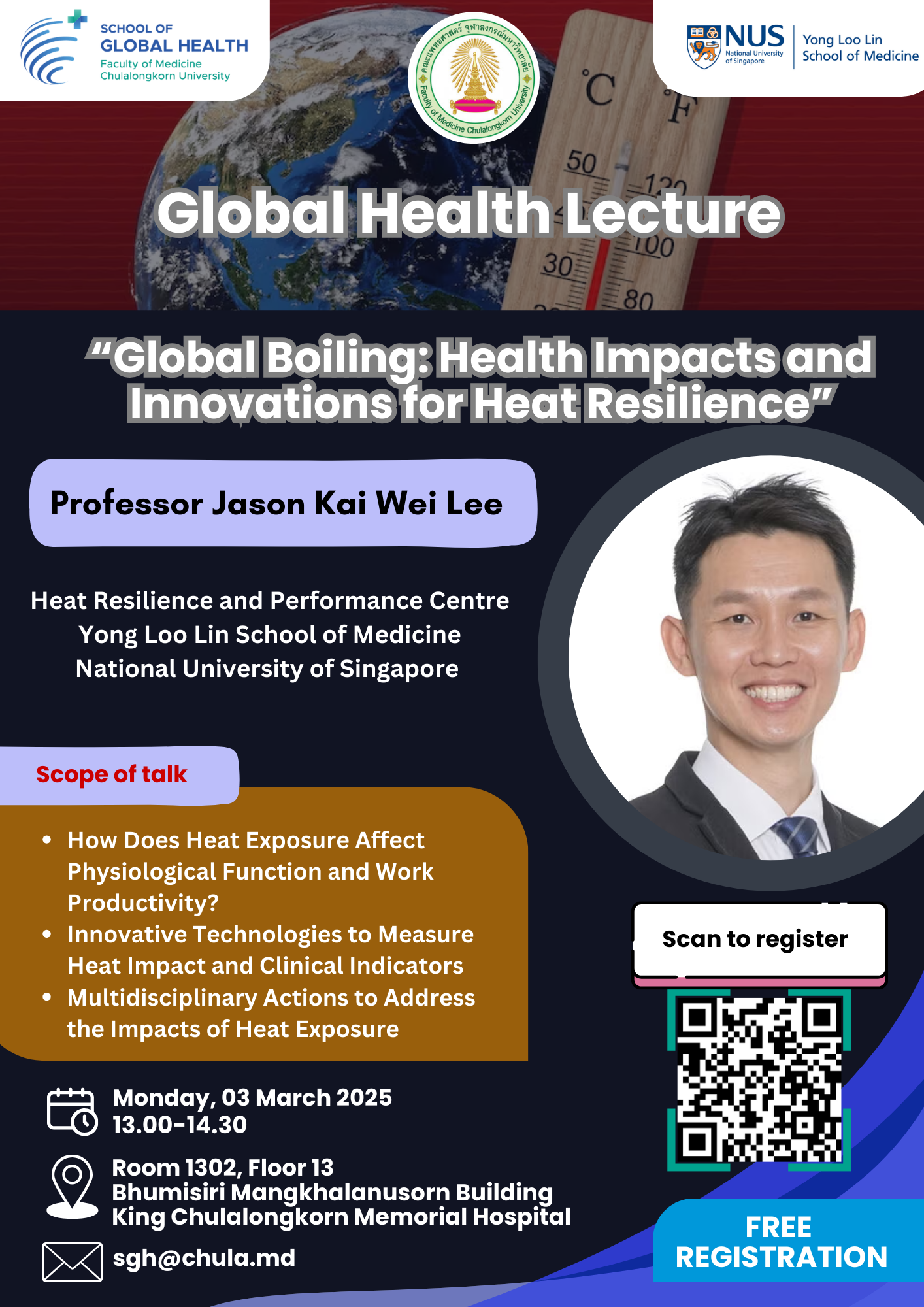 6 พ.ค. 2025 บรรยายพิเศษ Guest Lecture. “Global Boiling: Health Impacts and Innovations for Heat Resilience /Tags#mdcu, chula, chulalongkorn, medicine, คณะแพทยศาสตร์จุฬาลงกรณ์มหาวิทยาลัย, คณะแพทยศาสตร์จุฬาฯ, คณะแพทย์จุฬาฯ, แพทย์จุฬาฯ กลับไปหน้าข่าวประชาสัมพันธ์