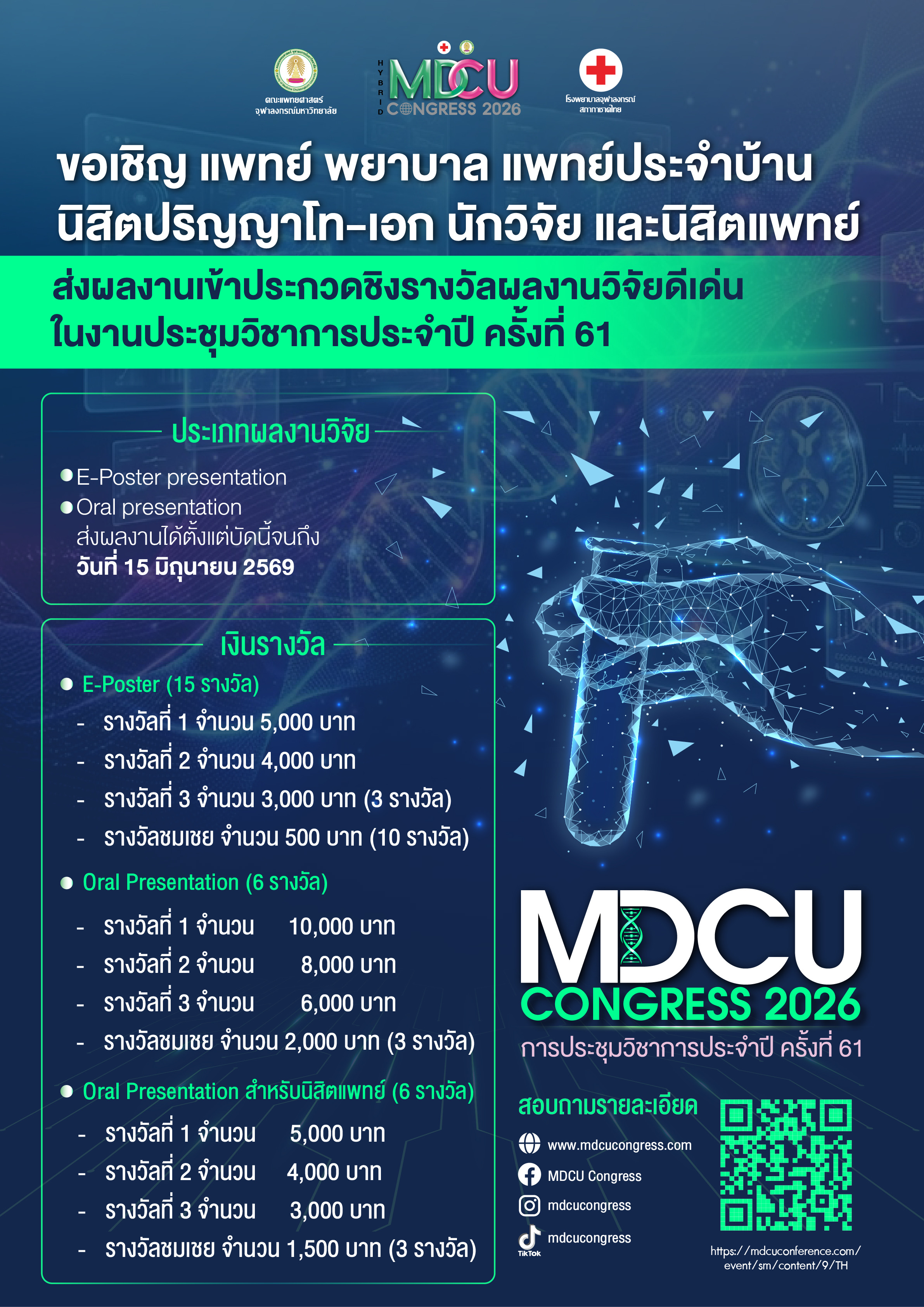 ขอเชิญแพทย์ พยาบาล แพทย์ประจำบ้าน นิสิตปริญญาโท-เอก นักวิจัย และนิสิตแพทย์ คณะแพทยศาสตร์ จุฬาลงกรณ์มหาวิทยาลัย และโรงพยาบาลจุฬาลงกรณ์ สภากาชาดไทย ส่งผลงานเข้าประกวดชิงรางวัลผลงานวิจัยดีเด่น ในงานประชุมวิชาการประจำปี ครั้งที่ 61 (MDCU Congress 2026) ตั้งแต่วันนี้ – 15 มิถุนายน 2569