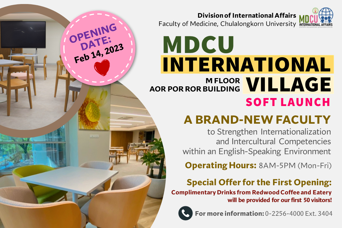 🎊 ฝ่ายวิรัชกิจ (International Affairs) คณะแพทยศาสตร์ จุฬาฯ ขอเรียนเชิญนิสิต คณาจารย์ บุคลากรคณะแพทยศาสตร์ จุฬาลงกรณ์มหาวิทยาลัย และโรงพยาบาลจุฬาลงกรณ์ สภากาชาดไทย รวมทั้งผู้สนใจ เข้าร่วมกิจกรรม Soft Launch การเปิดใช้งาน MDCU International Village ที่แห่งใหม่สำหรับจัดกิจกรรมที่เน้นการสื่อสารด้วยภาษาอังกฤษเป็นหลัก เปิดโอกาสในการแลกเปลี่ยนเรียนรู้ และเสริมสร้างประสบการณ์ความเป็นนานาชาติ