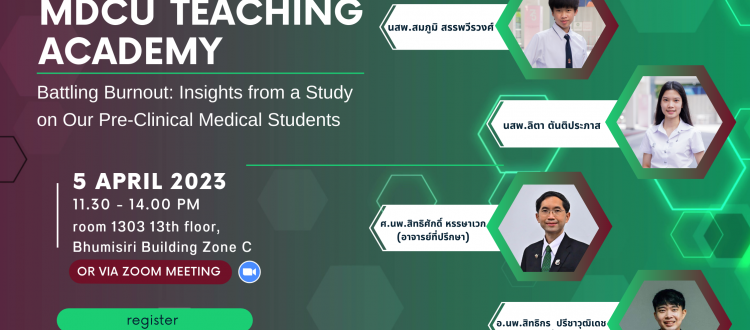 วันพุธที่ 5 เม.ย. นี้ 12.00-13.30 น. พบกับ นสพ. สมภูมิ สรรพวีรวง และ นสพ. ลิตา ตันติประภาส นิสิตปี นำเสนอผลการศึกษา A Cross-sectional Study of Burnout Syndrome among Pre-clinical Medical Students in Chulalongkorn University ซึ่งไปนำเสนอใน Thailand Medical Education Conference 2023 และได้รับรางวัล Best Oral Presentation กันนะคะ
