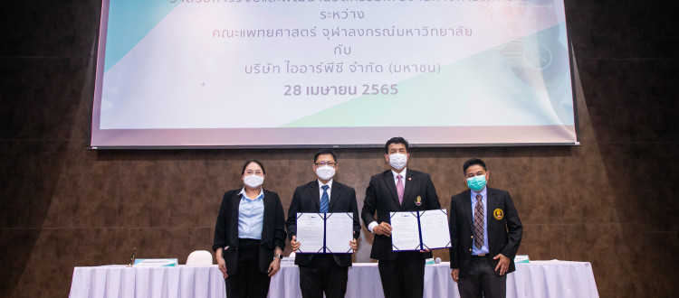 รศ.นพ.ฉันชาย สิทธิพันธุ์ คณบดี คณะแพทยศาสตร์ จุฬาลงกรณ์มหาวิทยาลัย และ นายพยม บุญยัง ผู้ช่วยกรรมการผู้จัดการใหญ่ ศูนย์นวัตกรรมไออาร์พีซี IRPC Innovation Center (IIC) บริษัท ไออาร์พีซี จำกัด (มหาชน) ร่วมกันลงนามบันทึกข้อตกลงความร่วมมือในการวิจัยและพัฒนาต่อยอดนวัตกรรมเพื่องานทางการแพทย์ โดยมี ศ.นพ.รังสรรค์ ฤกษ์นิมิตร ผู้อำนวยการศูนย์นวัตกรรมทางการแพทย์และการประกอบการ คณะแพทยศาสตร์ จุฬาลงกรณ์มหาวิทยาลัย และ ดร.อรพรรณ แสงสว่าง ผู้จัดการอาวุโส บริหารนวัตกรรมแบบเปิดและทรัพย์สินทางปัญญา ศูนย์นวัตกรรมไออาร์พีซี IRPC Innovation Center (IIC) บริษัท ไออาร์พีซี จำกัด (มหาชน) เข้าร่วมพิธี