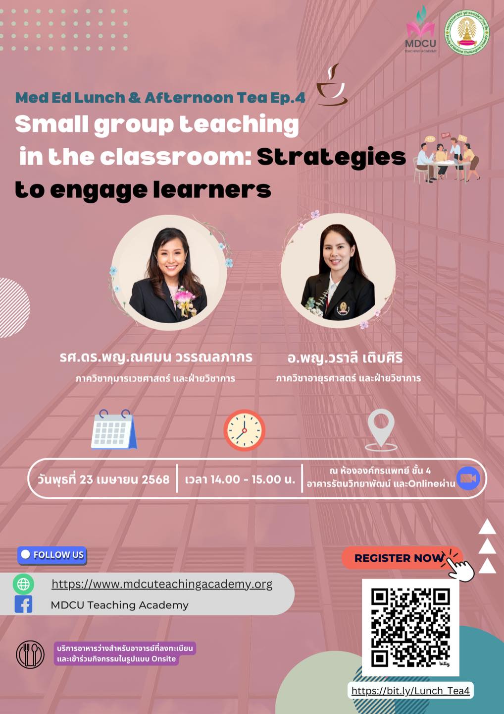 21 มิ.ย. 2025 Med Ed Lunch and Afternoon Tea EP 4. เรื่อง Small group teaching in the classroom: strategies to engage learners /Tags#mdcu, chula, chulalongkorn, medicine, คณะแพทยศาสตร์จุฬาลงกรณ์มหาวิทยาลัย, คณะแพทยศาสตร์จุฬาฯ, คณะแพทย์จุฬาฯ, แพทย์จุฬาฯ กลับไปหน้าข่าวประชาสัมพันธ์