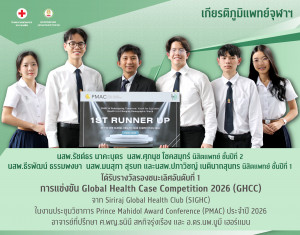 รางวัลรองชนะเลิศอันดับที่ 1 การแข่งขัน Global Health Case Competition 2026 (GHCC) จาก Siriraj Global Health Club (SIGHC) (เกียรติภูมิแพทย์จุฬาฯ) Posted on24 มี.ค. 2026Tags#mdcu, chula, chulalongkorn, medicine, คณะแพทยศาสตร์จุฬาลงกรณ์มหาวิทยาลัย, คณะแพทยศาสตร์จุฬาฯ, คณะแพทย์จุฬาฯ, เกียรติภูมิแพทย์จุฬาฯ, แพทย์จุฬาฯ