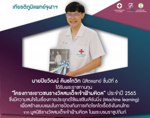 🎉 คณะแพทยศาสตร์ จุฬาฯ ขอแสดงความยินดีกับ นายปิยวัฒน์ คันธโกวิท นิสิตแพทย์ ชั้นปีที่ 6 ได้รับพระราชทานทุน “โครงการเยาวชนรางวัลสมเด็จเจ้าฟ้ามหิดล” ประจำปี 2565 Posted on02 ธ.ค. 2022Tags#mdcu, chula, chulalongkorn, medicine, คณะแพทยศาสตร์จุฬาลงกรณ์มหาวิทยาลัย, คณะแพทยศาสตร์จุฬาฯ, คณะแพทย์จุฬาฯ, เกียรติภูมิแพทย์จุฬาฯ, แพทย์จุฬาฯ