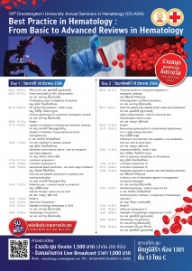 โครงการอบรม Chulalongkorn university Annual Seminars in Hematology (CU – ASH) ครั้งที่ 19 ใน Theme Evidence Based Hematology from Evidence to Real World Practice Posted on02 ธ.ค. 2022Tags#mdcu, chula, chulalongkorn, medicine, คณะแพทยศาสตร์จุฬาลงกรณ์มหาวิทยาลัย, คณะแพทยศาสตร์จุฬาฯ, คณะแพทย์จุฬาฯ, แพทย์จุฬาฯ วันที่ 18-19 มีนาคม 2566 เวลา 08.30-17.00 น. 🏥 Onsite อาคารภูมิสิริมังคลานุสรณ์ ชั้น 13 โซน C ห้อง 1301 ราคา 1,500 บาท (จำกัด 200 ที่นั่ง) 🎬 Online รับชมผ่านทาง Live Broadcast ราคา 1... Read More