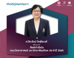 คณะแพทยศาสตร์ จุฬาฯ ขอแสดงความยินดีกับ ศ.ปิยะรัตน์ โตสุโขวงศ์ ได้รับรางวัล ศิษย์เก่าดีเด่น คณะวิทยาศาสตร์ มหาวิทยาลัยมหิดล ประจำปี 2565 Posted on17 ต.ค. 2022Tags#mdcu, chula, chulalongkorn, medicine, คณะแพทยศาสตร์จุฬาลงกรณ์มหาวิทยาลัย, คณะแพทยศาสตร์จุฬาฯ, คณะแพทย์จุฬาฯ, เกียรติภูมิแพทย์จุฬาฯ, แพทย์จุฬาฯ