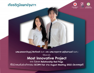 คณะแพทยศาสตร์ จุฬาฯ ขอแสดงความยินดีกับ นสพ.พลอยกวิญญ์ ชัยเกียรติ ชั้นปีที่ 3 และ นสพ.กฤตภาส มธุรันยานนท์ ชั้นปีที่ 2 ได้รับรางวัล Most Innovative Project จาก โปรเจค Relationship Red Flags Posted on18 ต.ค. 2022Tags#mdcu, chula, chulalongkorn, medicine, คณะแพทยศาสตร์จุฬาลงกรณ์มหาวิทยาลัย, คณะแพทยศาสตร์จุฬาฯ, คณะแพทย์จุฬาฯ, เกียรติภูมิแพทย์จุฬาฯ, แพทย์จุฬาฯ