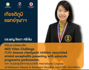 🎉 คณะแพทยศาสตร์ จุฬาฯ ขอแสดงความยินดีกับ ดร.พญ.จิรดา ศรีเงิน ได้รับรางวัลชนะเลิศ MDS Video Challenge หัวข้อ Immune checkpoint inhibitor associated striatal encephalitis presenting with subacute progressive parkinsonism. Posted on28 ก.ย. 2022Tags#mdcu, chula, chulalongkorn, medicine, คณะแพทยศาสตร์จุฬาลงกรณ์มหาวิทยาลัย, คณะแพทยศาสตร์จุฬาฯ, คณะแพทย์จุฬาฯ, เกียรติภูมิแพทย์จุฬาฯ, แพทย์จุฬาฯ