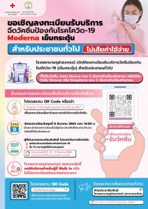 โรงพยาบาลจุฬาลงกรณ์ เปิดให้ลงทะเบียนรับบริการ ฉีดวัคซีนป้องกันโรคโควิด-19 Moderna เข็มกระตุ้น สำหรับประชาชนทั่วไป สามารถลงทะเบียนและอ่านรายละเอียดเพิ่มเติมได้ที่ สแกน QR Code หรือ https://chulabooster... Read More