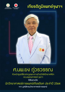ศ.นพ.ยง ภู่วรวรรณ ได้รับรางวัล “นักวิทยาศาสตร์การแพทย์เกียรติยศ ประจำปี 2564” จาก มูลนิธิกรมวิทยาศาสตร์การแพทย์ (เกียรติภูมิแพทย์จุฬาฯ) Posted on14 ก.ย. 2021Tags#mdcu, chula, chulalongkorn, medicine, คณะแพทยศาสตร์จุฬาลงกรณ์มหาวิทยาลัย, คณะแพทยศาสตร์จุฬาฯ, คณะแพทย์จุฬาฯ, แพทย์จุฬาฯ