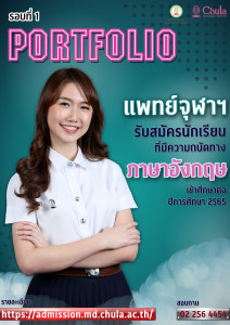 ประกาศรับสมัครสอบคัดเลือกนักเรียนที่มีความถนัดทางภาษาอังกฤษ TCAS65 รอบที่ 1 แฟ้มสะสมผลงาน (Portfolio) ปีการศึกษา 2565 Posted on13 ก.ย. 2021Tags#mdcu, chula, chulalongkorn, medicine, คณะแพทยศาสตร์จุฬาลงกรณ์มหาวิทยาลัย, คณะแพทยศาสตร์จุฬาฯ, คณะแพทย์จุฬาฯ, แพทย์จุฬาฯ